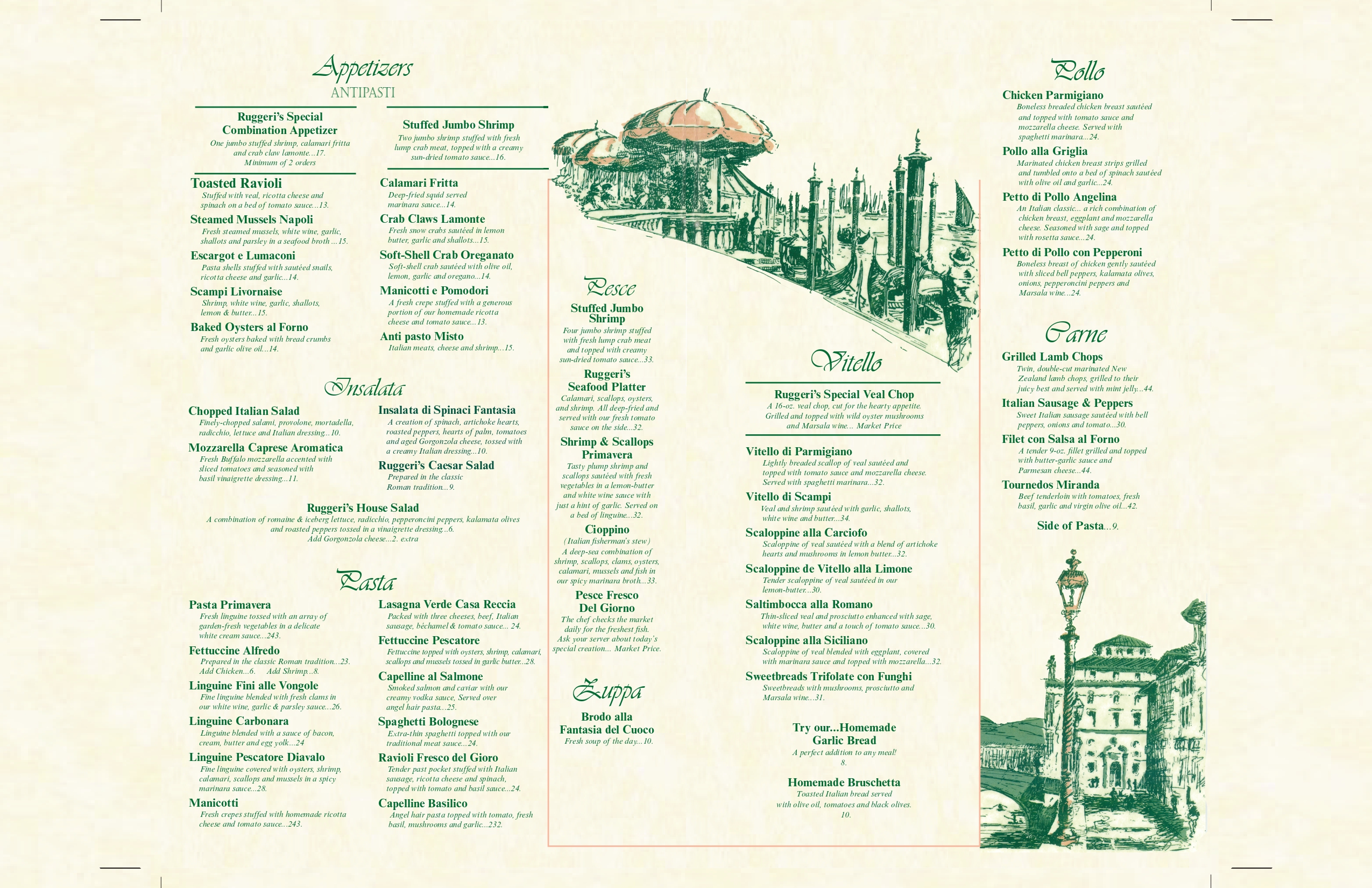 We have missed you all and are looking forward to presenting you with the same impeccably prepared cuisine and warm, family atmosphere you've come to expect and love from Ruggeri's. Our new location is beautiful, our menu is the same and you'll see the same friendly faces you always have when you walk